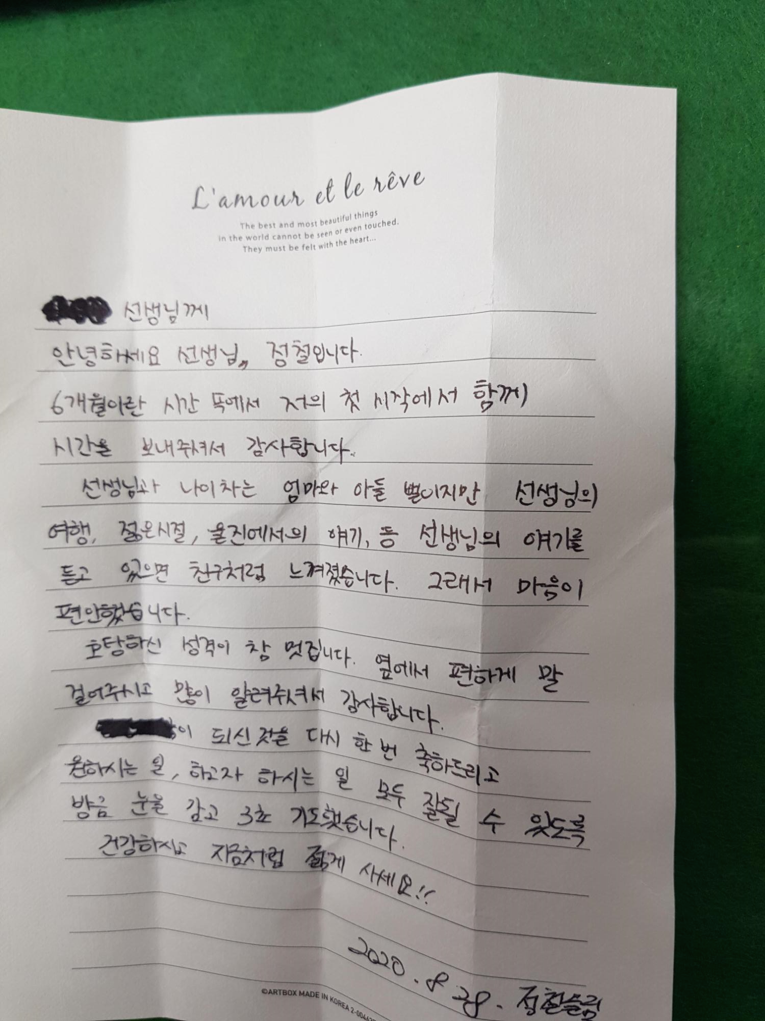 떠나면서 교실 앞문에 올려 놓은 편지에 가슴이 찡하다.