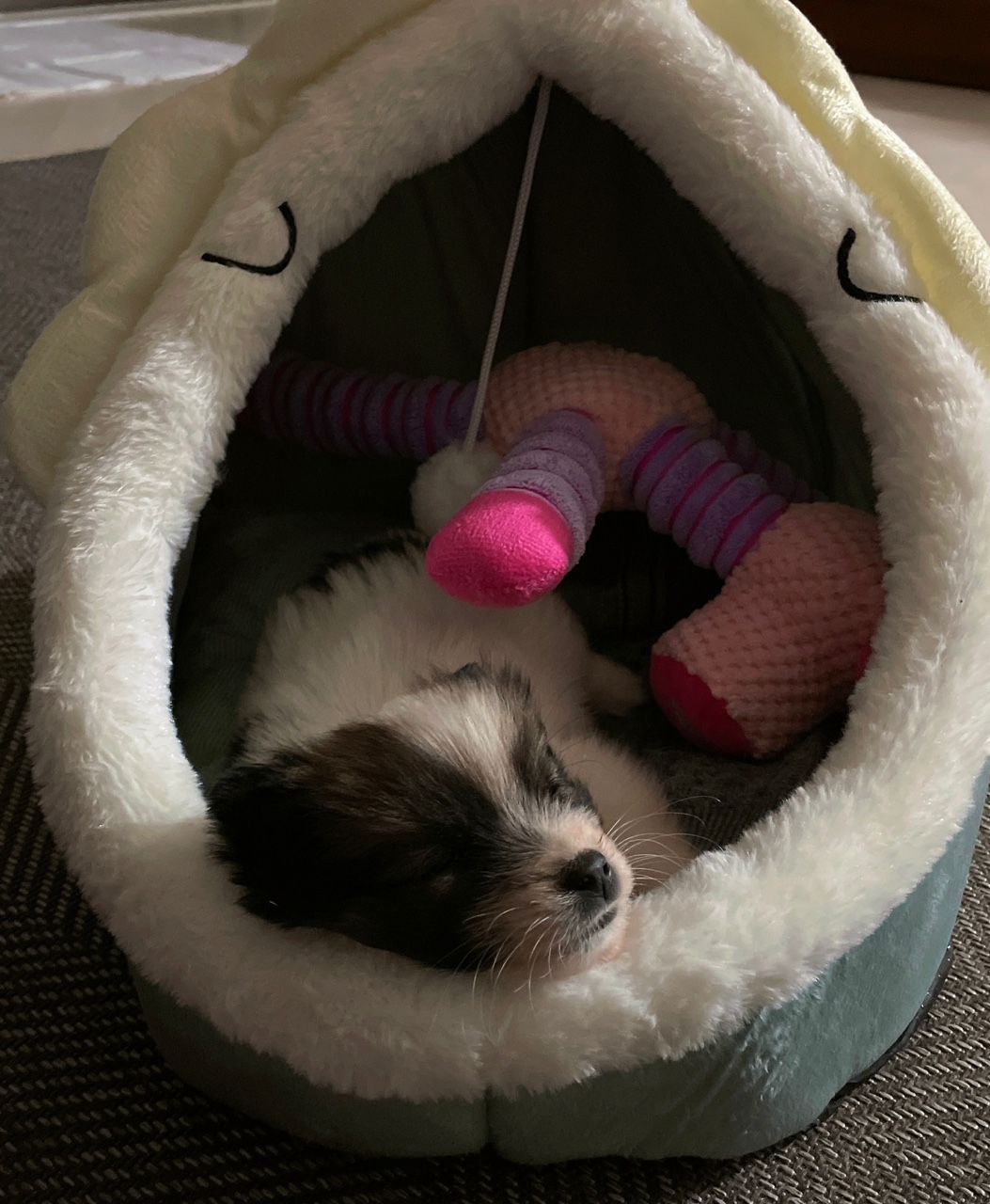 장난감 친구 보호 아래 잘 자고 있어요.