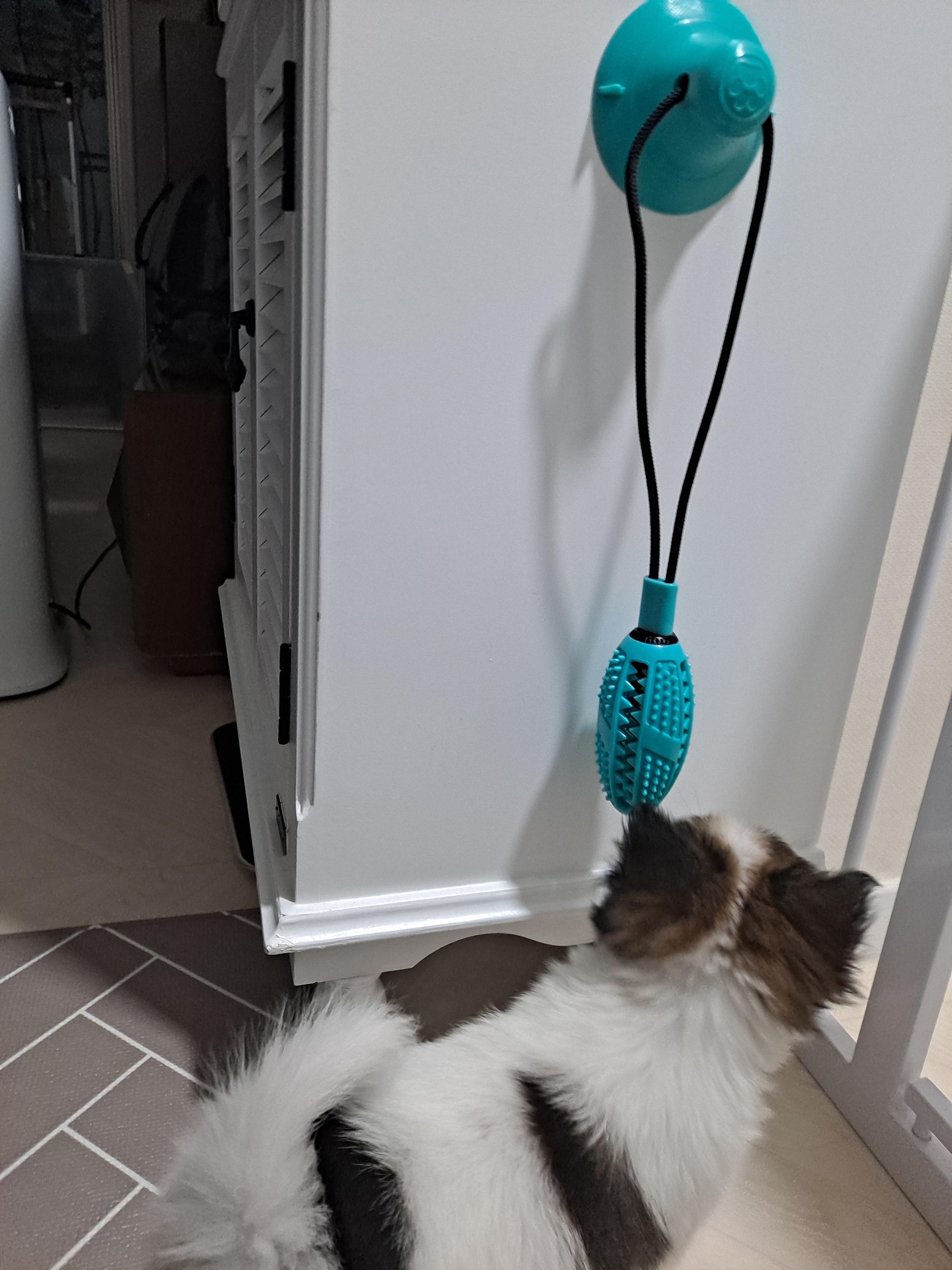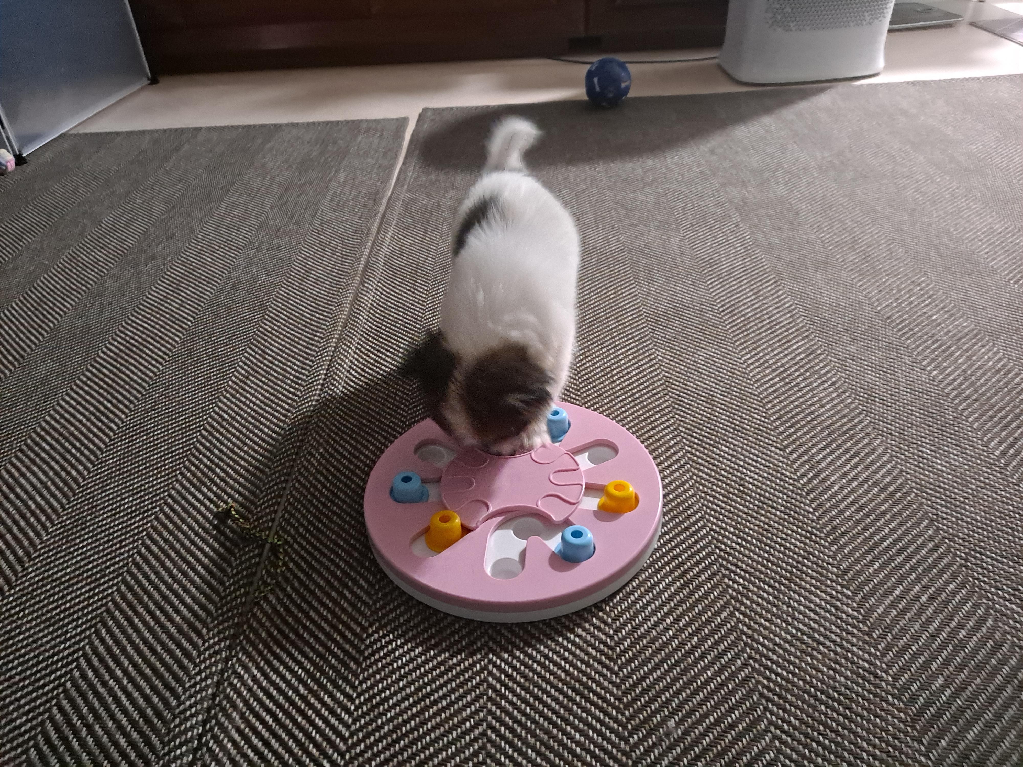 돌려가면서 굴리다가 먹이 떨어지니 잽싸게 주워 먹는다.