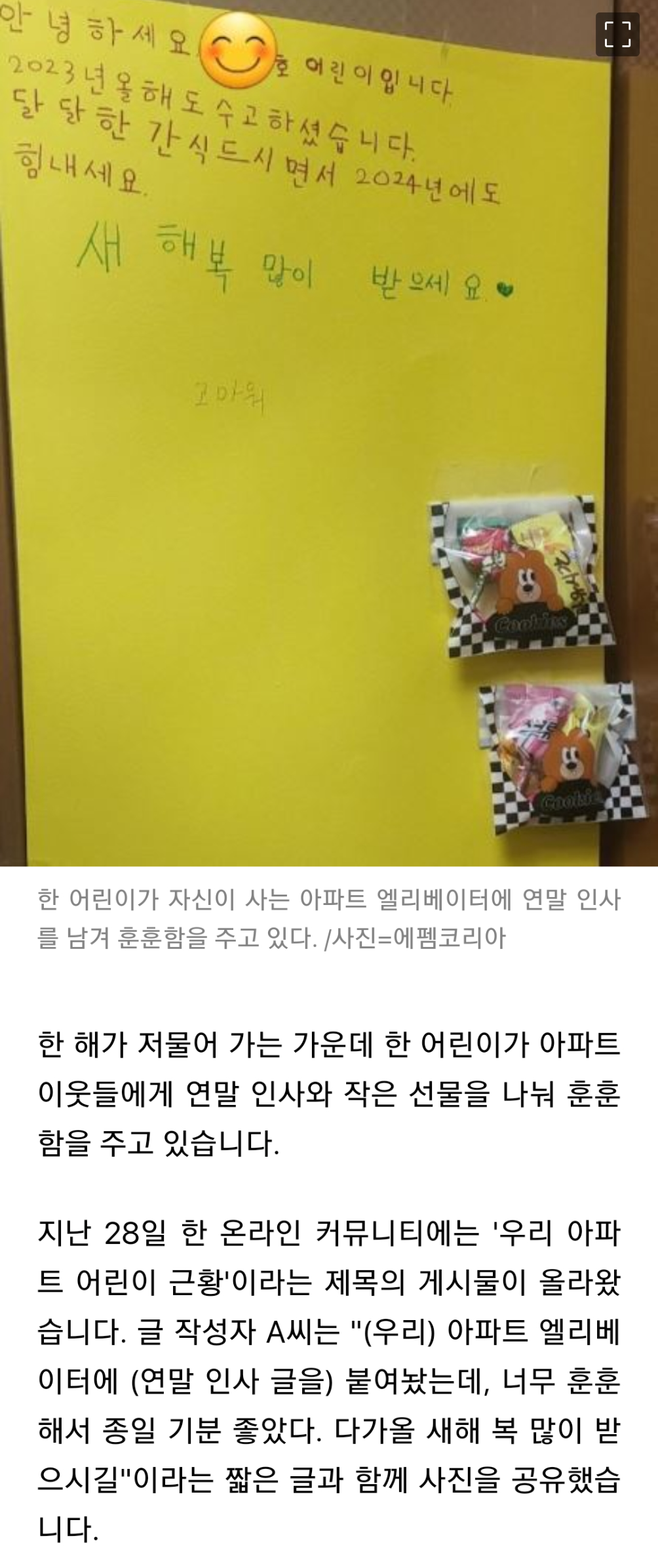 비뚤배뚤한 인사말과 함께 달려있는 과자 봉지